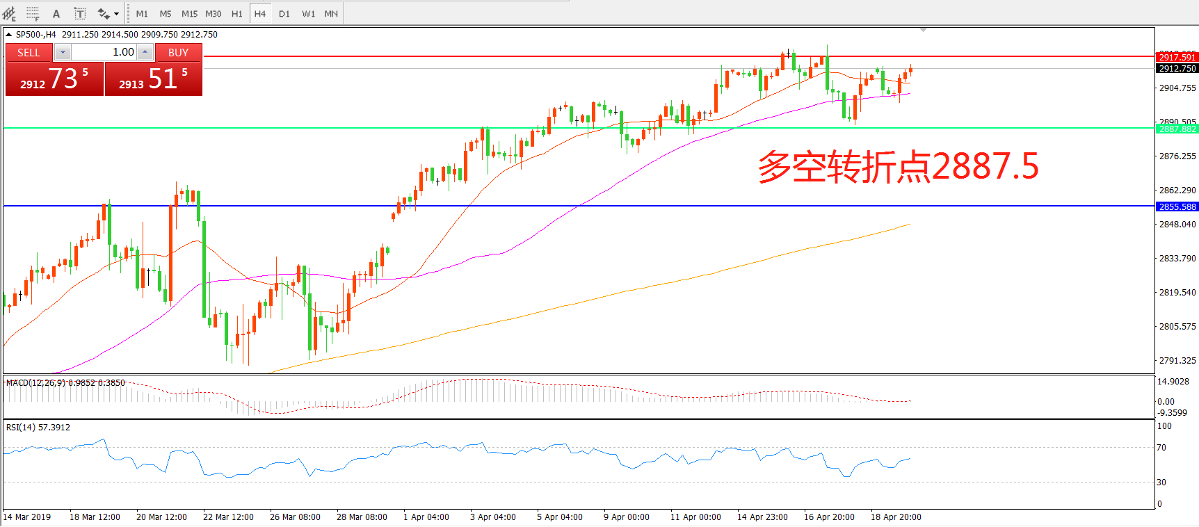 4小时图看,标普500回落后以55周期均线为依托逐渐反弹,整体走势较强, MACD红柱增加,RSI指标向上,日内重点关注上方2917一线得失。