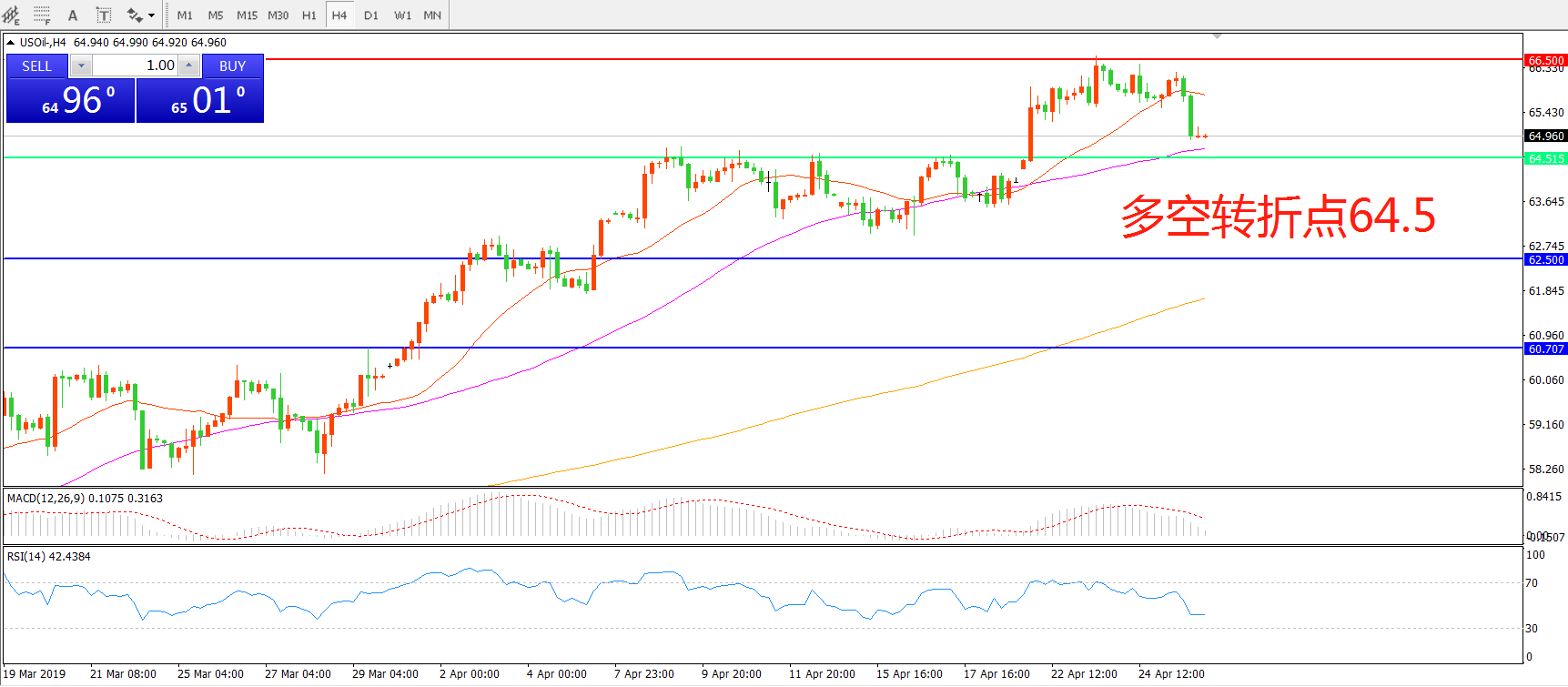 4小时图看,油价冲高回落,跌破21均线支撑,短期出现调整,MACD红柱减少,RSI指标走平,日内重点关注64.5一线。