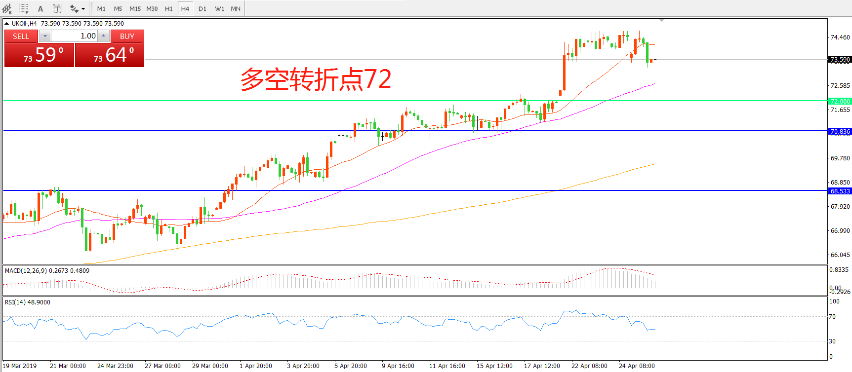 4小时图看,油价冲高回落,跌破21均线支撑,短期出现调整,MACD红柱减少,RSI指标向下,日内重点关注72.5一线。