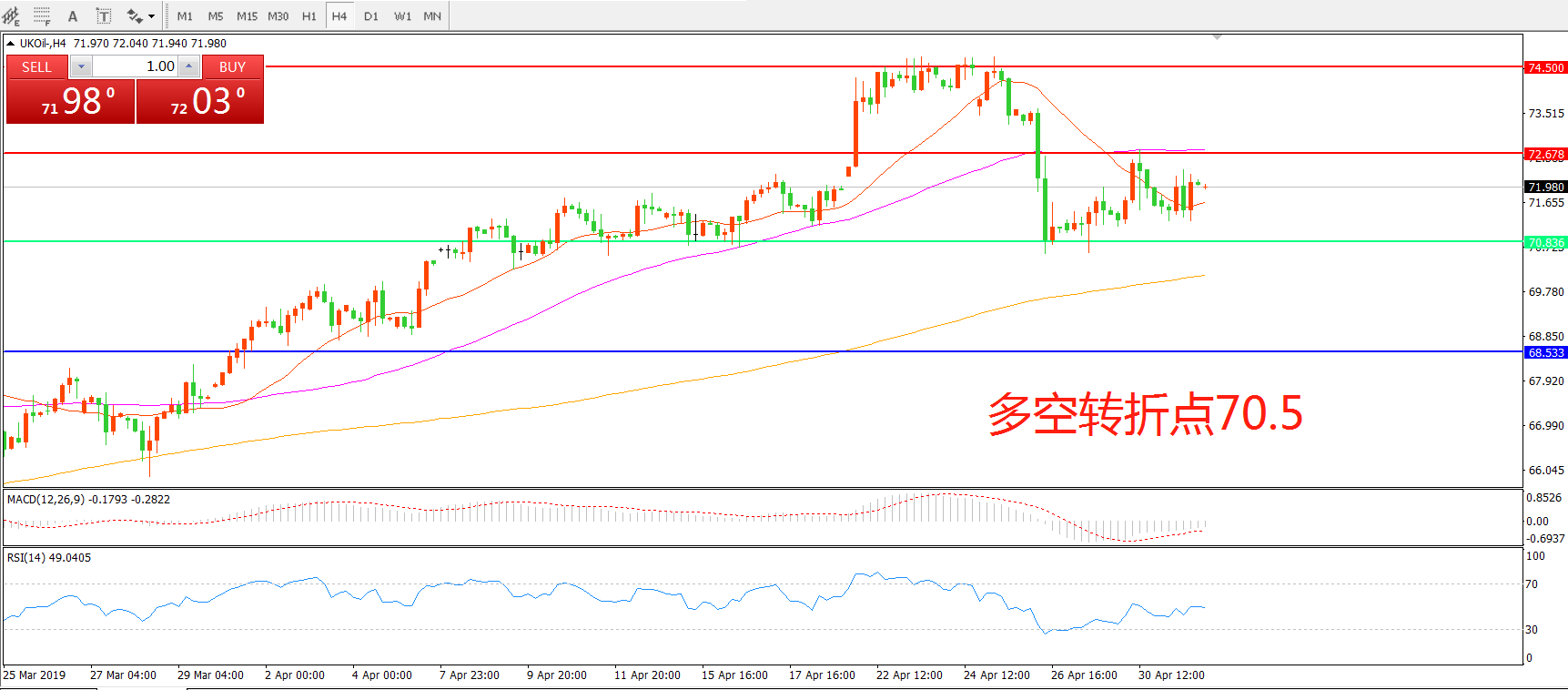 美国能源信息署周三(5月1日)公布报告显示,截至4月26日当周,美国EIA原油库存增加993.4万桶,利空油价,但委内瑞拉动荡局势加剧以及美国加大伊朗制裁力度部分限制了油价的下行空间,油价呈现宽幅震荡走势,布伦特原油小幅收涨,报72.03美元/桶。