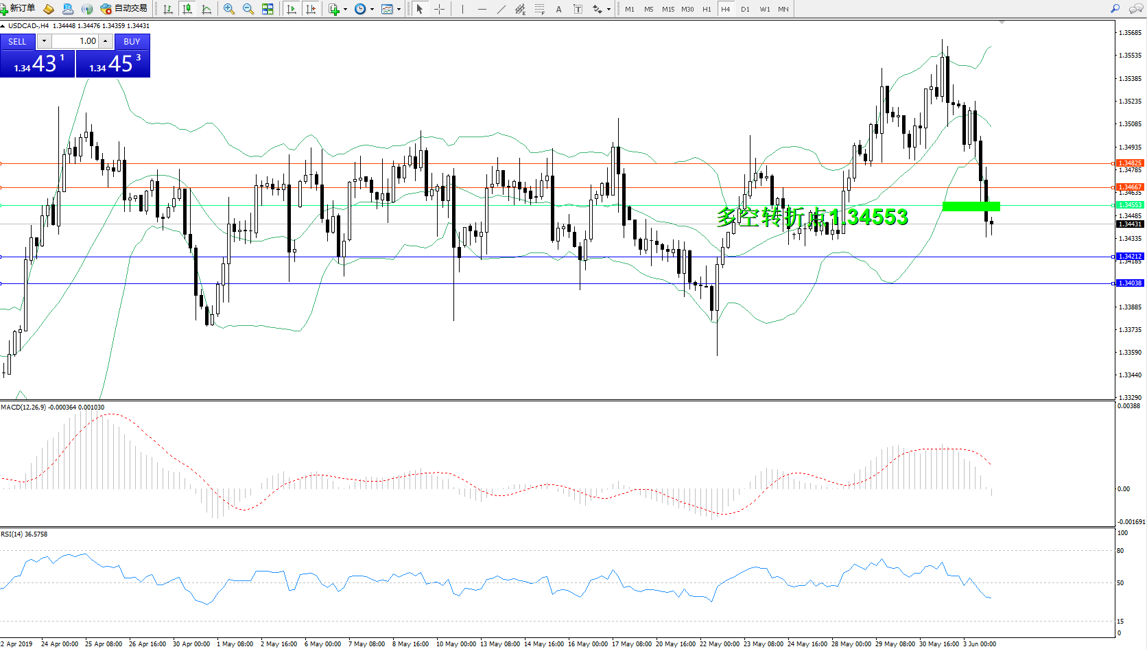 交易策略:1.34553下方看跌,目标1.34212、1.34038