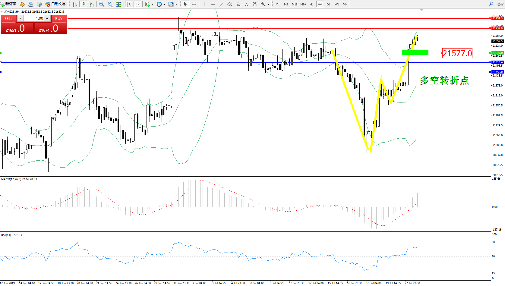 技术点评:低位V型反转上行后,多头持续拉升态势明显,延续布林带指标上轨持续上攻,MACD指标多头区域持续上扬,RSI指标多头区域有拐头迹象;
