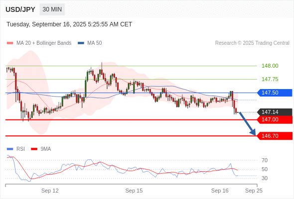 在 147.50 之下,看跌,目标价位为 147.00 ,然后为 146.70 。
