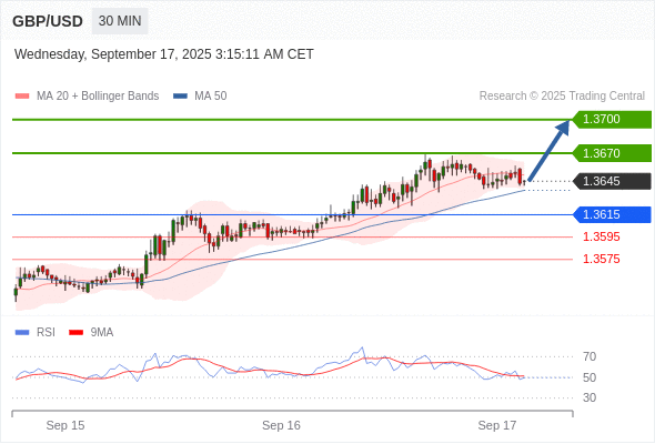 在 1.3615 之上,看涨,目标价位为 1.3670 ,然后为 1.3700 。