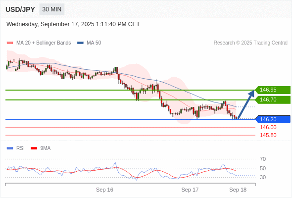 在 146.20 之上,看涨,目标价位为 146.70 ,然后为 146.95 。