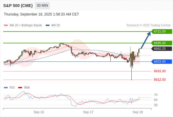 在 6653.00 之上,看涨,目标价位为 6695.00 ,然后为 6721.00 。