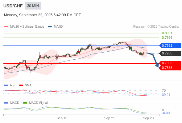 美元/瑞郎 当日内 : 看跌,在 0.7961 之下。