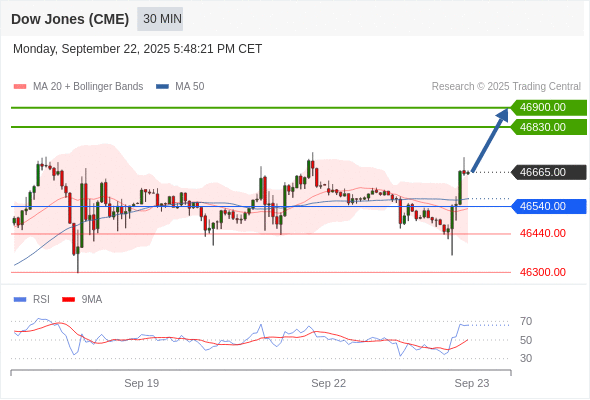 美国道琼斯指数期货 (Z5) 当日内: 在46540.00之上,看涨。