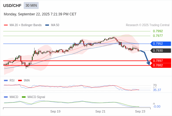美元/瑞郎 当日内 : 看跌,在 0.7952 之下。