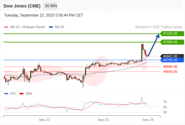 在 46785.00 之上,看涨,目标价位为 47060.00 ,然后为 47190.00 。
