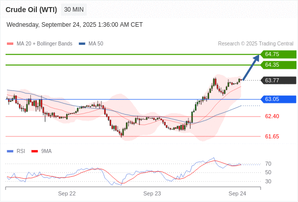 在 63.05 之上,看涨,目标价位为 64.35 ,然后为 64.75 。