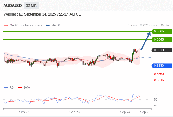 在 0.6580 之上,看涨,目标价位为 0.6645 ,然后为 0.6665 。