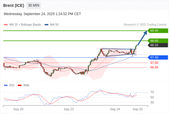 在 67.40 之上,看涨,目标价位为 68.65 ,然后为 69.40 。