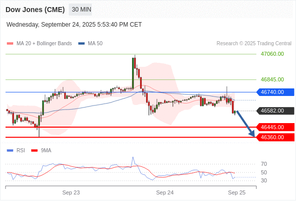 在 46740.00 之下,看跌,目标价位为 46445.00 ,然后为 46360.00 。