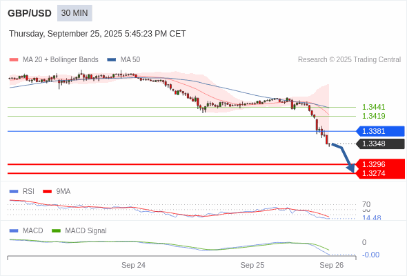 技术点评: RSI技术指标小于30。在这种情况下,说明有很强的下跌趋势,或者意味着处在超卖的状态下,可能会有向上的反弹。我们将观察RSI技术指标是否出现背离现象。 MACD技术指标处在其信号线之下看空。 配置为负。 此外,价位低于其20天及50天移动平均线 ( 分别位于1.3422 和1.3440 )。
