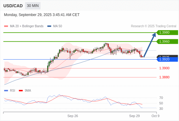 在 1.3920 之上,看涨,目标价位为 1.3960 ,然后为 1.3980 。