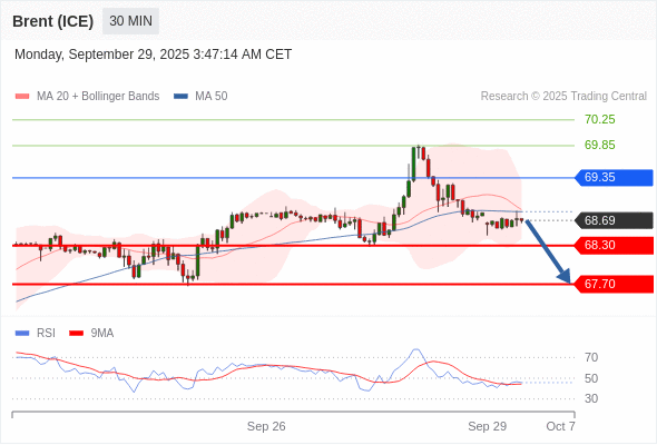 在 69.35 之下,看跌,目标价位为 68.30 ,然后为 67.70 。
