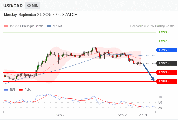 在 1.3950 之下,看跌,目标价位为 1.3900 ,然后为 1.3880 。