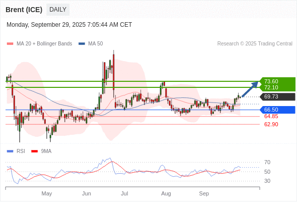 在 66.50 之上,看涨,目标价位为 72.10 ,然后为 73.60 。