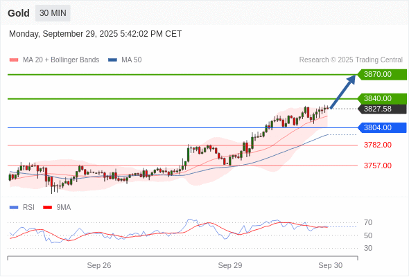 在 3804.00 之上,看涨,目标价位为 3840.00 ,然后为 3870.00 。