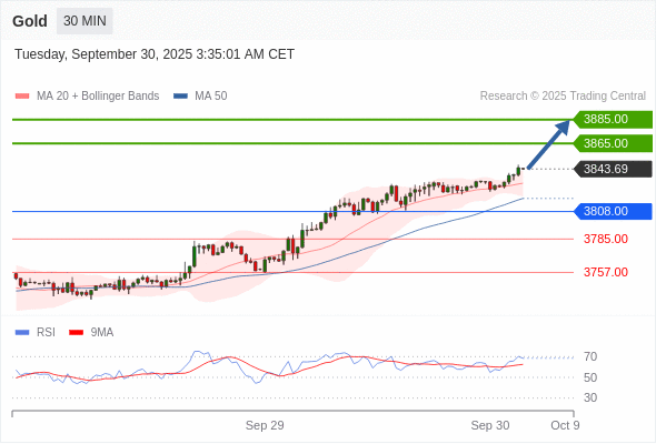 在 3808.00 之上,看涨,目标价位为 3865.00 ,然后为 3885.00 。