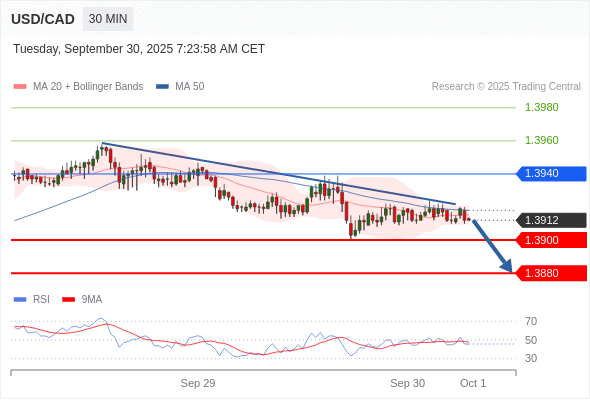 在 1.3940 之下,看跌,目标价位为 1.3900 ,然后为 1.3880 。