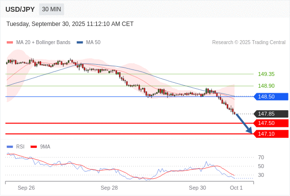 在 148.50 之下,看跌,目标价位为 147.50 ,然后为 147.10 。
