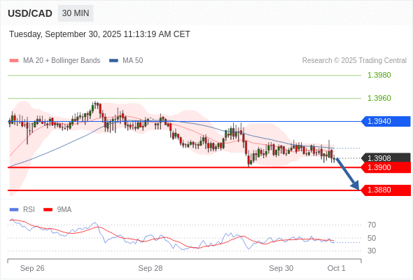 在 1.3940 之下,看跌,目标价位为 1.3900 ,然后为 1.3880 。