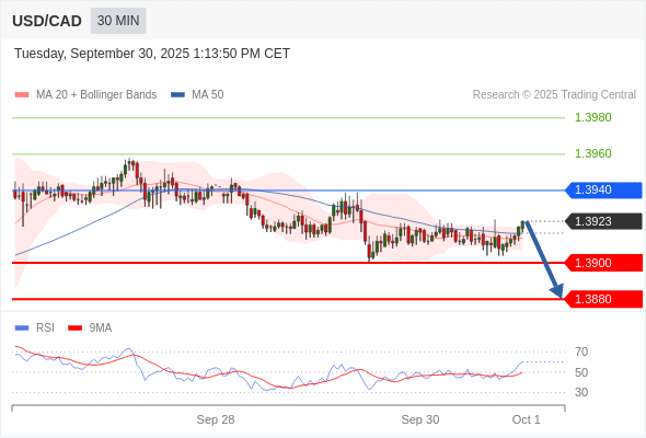 在 1.3940 之下,看跌,目标价位为 1.3900 ,然后为 1.3880 。