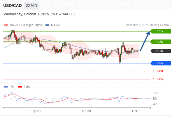 在 1.3895 之上,看涨,目标价位为 1.3935 ,然后为 1.3955 。