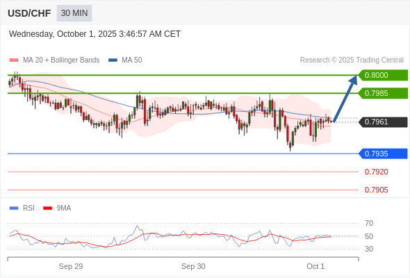美元/瑞郎 当日内: 在0.7935之上,看涨。