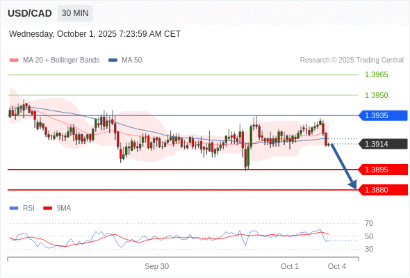在 1.3935 之下,看跌,目标价位为 1.3895 ,然后为 1.3880 。