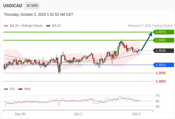 在 1.3910 之上,看涨,目标价位为 1.3955 ,然后为 1.3970 。