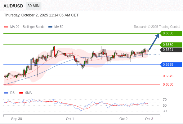 在 0.6595 之上,看涨,目标价位为 0.6630 ,然后为 0.6650 。