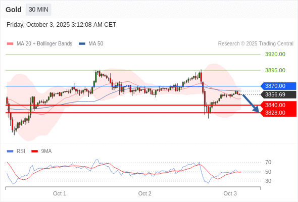 交易策略: 在 3870.00 之下,看跌,目标价位为 3840.00 ,然后为 3828.00 。