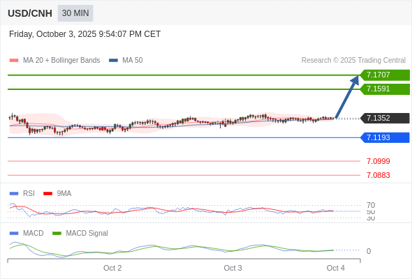 备选策略: 如跌破 7.1193 ,USD/CNH 目标方向定在 7.0999 和 7.0883 。