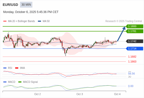 欧元/美元 当日内 : 看涨,当 1.1714 为支撑位,目标定在1.1800。