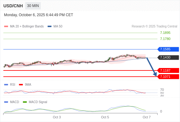 备选策略: 向上突破 7.1585 ,将带来继续上行的趋势,目标位定在 7.1780 和 7.1895 。