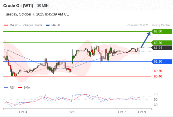 在 61.20 之上,看涨,目标价位为 62.20 ,然后为 62.80 。