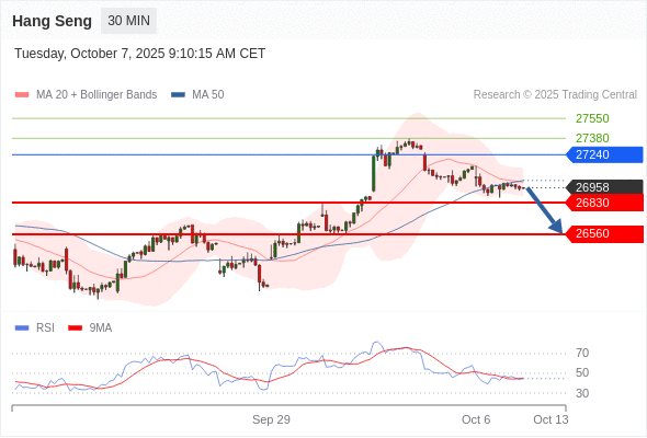 恒生指数 当日内: 目标位为26560。
