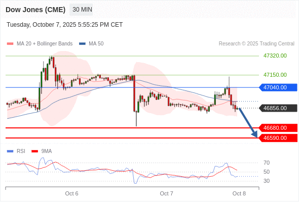 在 47040.00 之下,看跌,目标价位为 46680.00 ,然后为 46590.00 。