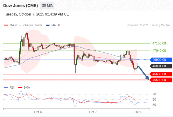 在 46900.00 之下,看跌,目标价位为 46680.00 ,然后为 46590.00 。