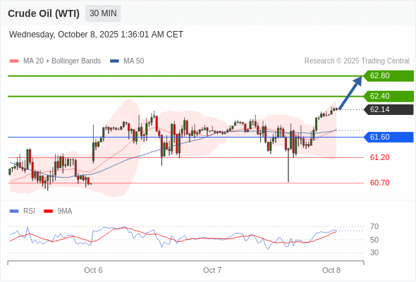 在 61.60 之上,看涨,目标价位为 62.40 ,然后为 62.80 。