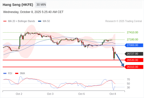 在 27000.00 之下,看跌,目标价位为 26530.00 ,然后为 26310.00 。