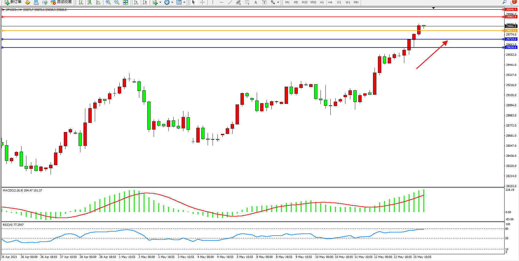 日经225指数5月15日(周一)收盘上涨228.20点,涨幅0.78%,报29616.50点。日本政府最高经济委员会召开会议,重点讨论近期通胀和薪资增长是否表明日本正接近持续摆脱通缩。