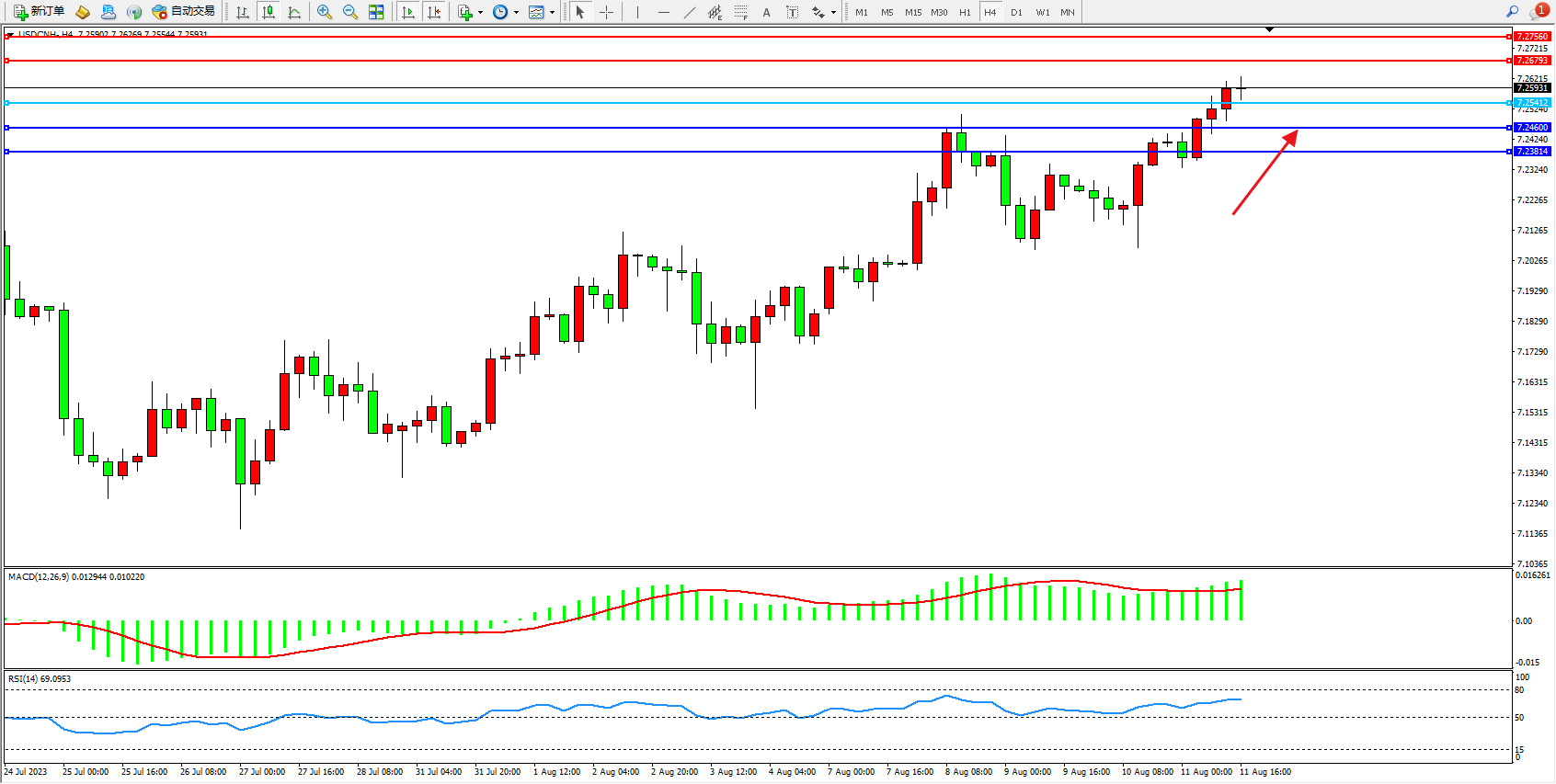交易策略:7.25412上方看涨,目标7.26793 7.27560