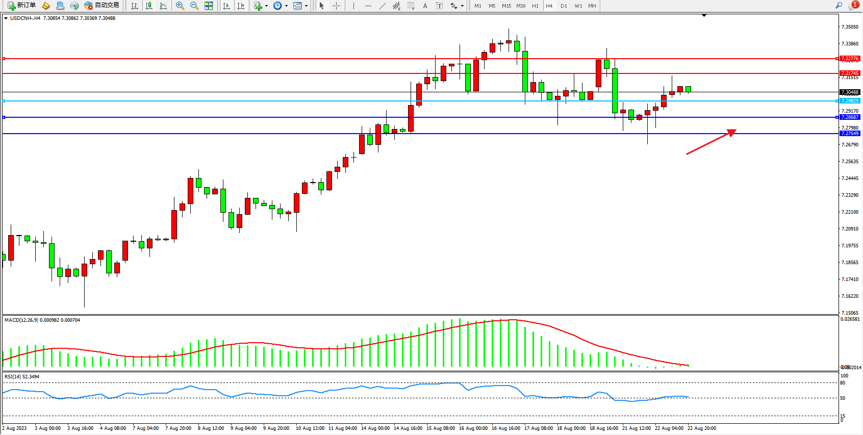 美元人民币USDCNH——4小时K线图显示: