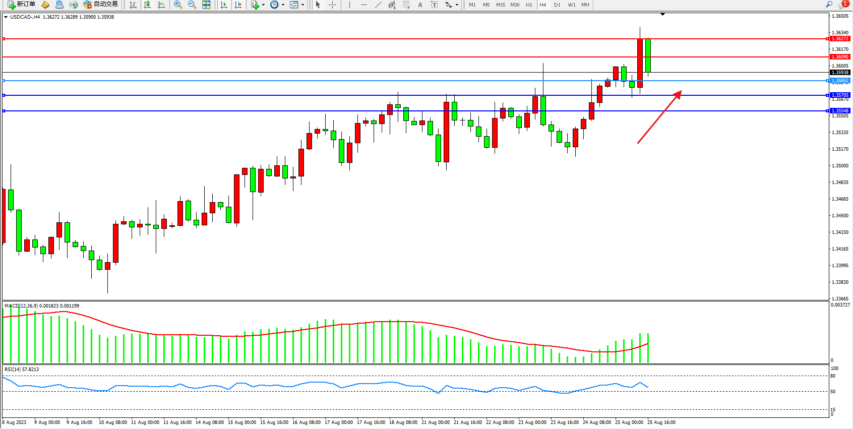 4小时图看:高位多头动力维持震荡上扬,短期高位遇阻回撤,市场看涨情绪依旧,MACD指标处于多头区域持续上移,RSI指标处于50均衡线上側弱势整理;