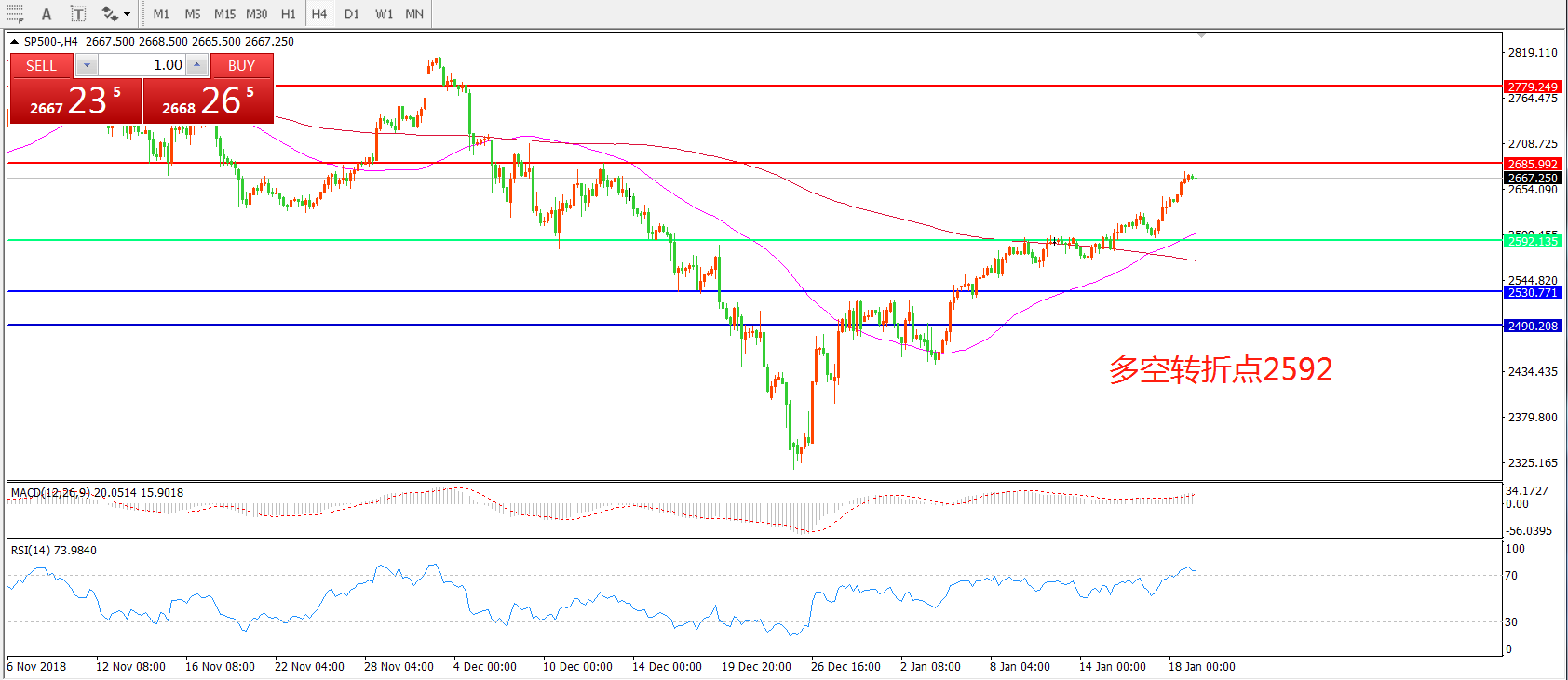 4小时图看,SP500近期逐渐站稳200周期均线,短期55均线有拐头上升迹象,MACD红柱缩短,小幅反弹成为可能。