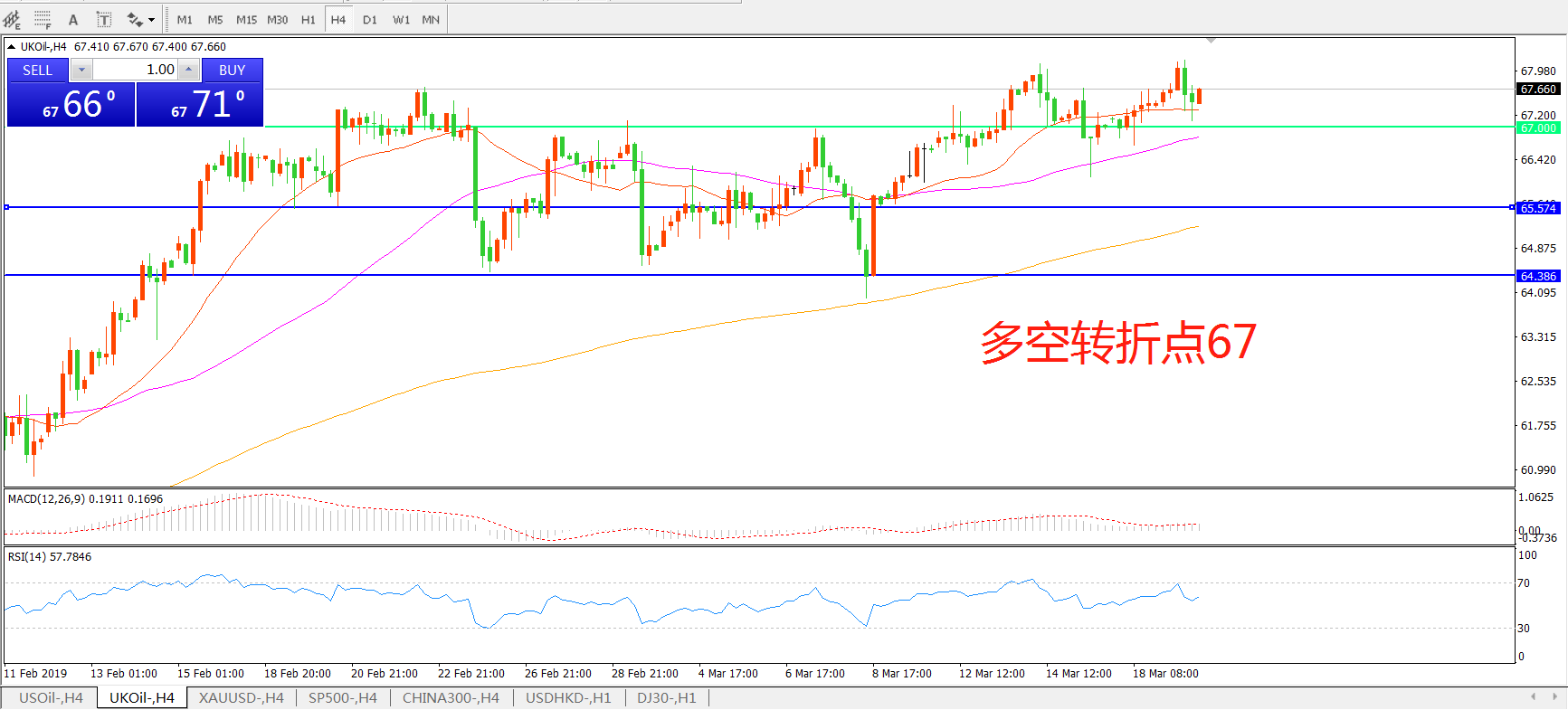 4小时图看,布油价维持高位盘整姿态,波幅较窄,但整体位于均线系统之上,MACD红柱减少,RSI指标走平,短期以多头思路为主。
